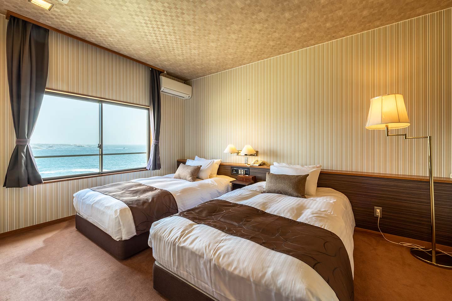 HOTEL AZUMA の客室は、空と海のコントラストが美しい「オーシャンビュー」、水平線に沈む夕陽がお部屋から楽しめる「サンセットオーシャンフロント」の2つのスタイル。